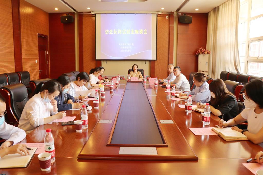 为持续提升就业服务水平,积极拓展新兴就业空间,全面推行校企协同育人,6月7日,经济管理学院在崇德楼A307会议室举行了“书记校长访企拓岗促就业”座谈会。参加座谈会的有副校长李敏,经济管理学院党委书记、院长张国兴,经济管理学院其他领导班子成员,各教研室主任,毕业班、准毕业班辅导员及学生代表。会议邀请了中建新疆建工(集团)华北分公司、中国新兴建设开发有限责任公司、中建八局华北公司、中国中铁六局集团建筑安装工程有限公司、中国电建集团河北工程有限公司、上海第一测量师事务所有限公司、北京城建十六建筑工程有限责任公司、东海建设集团、天俱时工程科技集团有限公司等十八家公司。座谈会分为上下午各一场。
