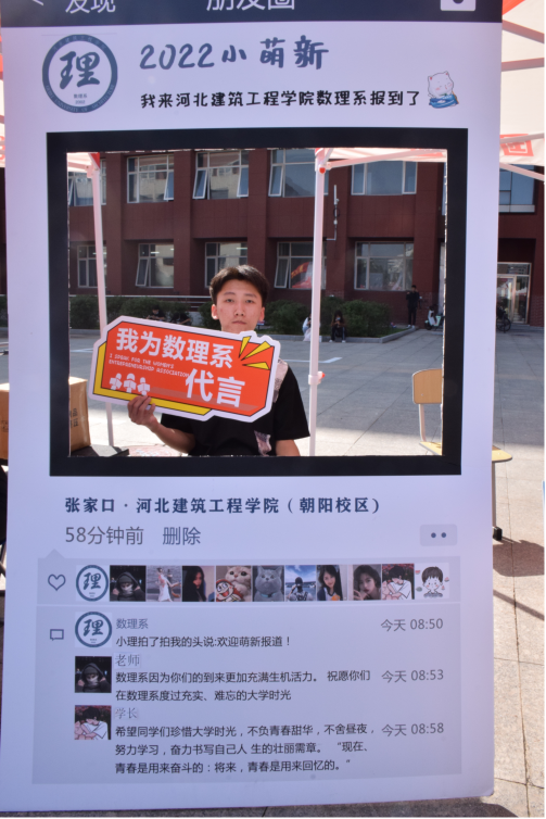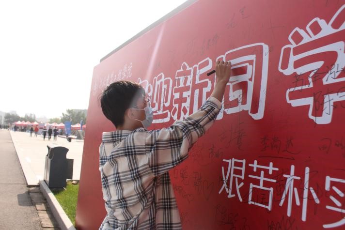 学生处、校团委、各院系为新生准备了签名墙和拍照背景墙,新生们纷纷在签名墙上签名,在拍照拍照背景墙前打卡,点亮自己的大学生活。