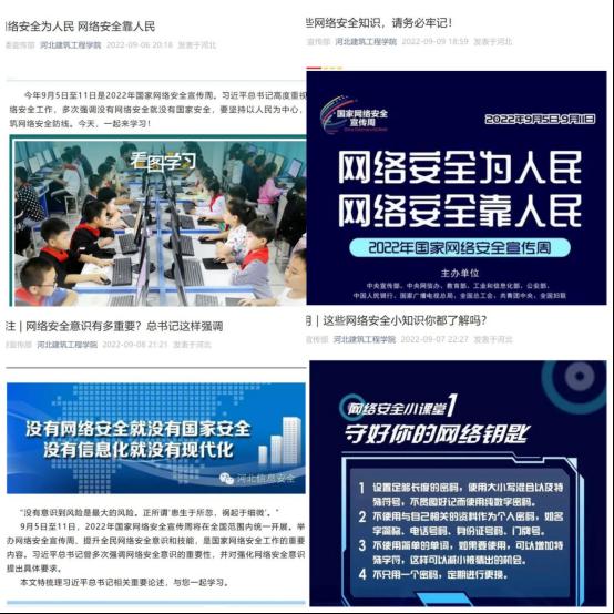 学校官方微博参与了网络安全微博话题互动。全校各单位通过电子屏、橱窗、展板等媒介宣传网络安全宣传标语、介绍网络安全知识。学校和各院系微信公众平台及网站连续发布网络安全知识文章、宣传视频等,并及时报道本单位网络安全宣传周活动成果。