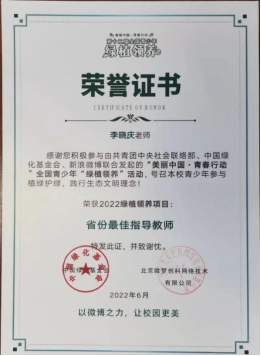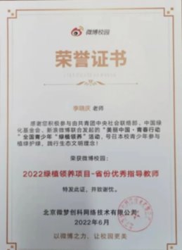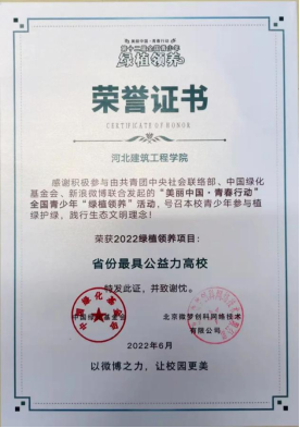 近日,学校收到了中国绿化基金会和北京微梦创科网络技术有限公司颁发的“美丽中国·青春行动”第十二届全国青少年绿植领养活动省份最具公益力高校荣誉证书,李晓庆荣获省份最佳指导教师、省份优秀指导教师。本届活动以高校团员青年为重点群体,共有全国25个省级团委官微在微博平台积极发声,1238所高校(其中河北高校56所)官方微博参与线上活动,广泛覆盖126.12万在校大学生,我校取得了河北省第2、全国第14的历史最好成绩。