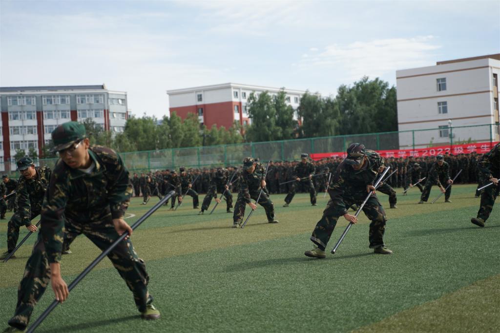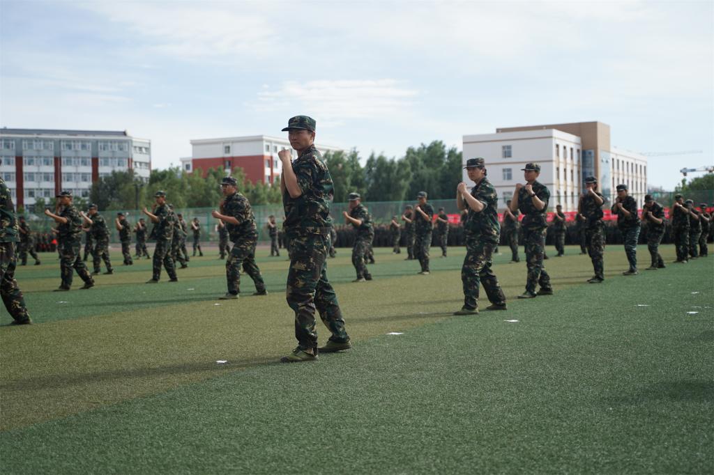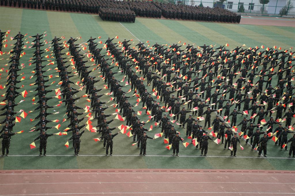 军训汇报表演环节,擒敌拳方队、应急棍方队、旗语方队依次进行了课目演示。各方队动作整齐划一、刚健有力,口号高亢嘹亮,一招一式间尽显披荆斩棘的壮志与豪情。