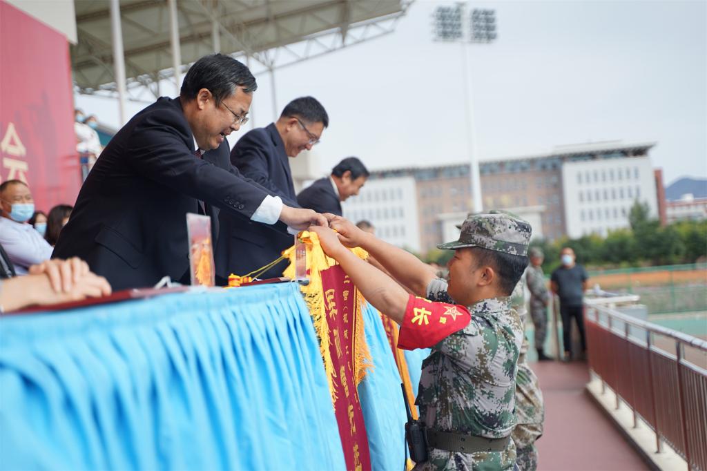 师涌江代表学校向全体退役大学生教官赠送锦旗并致以谢意。