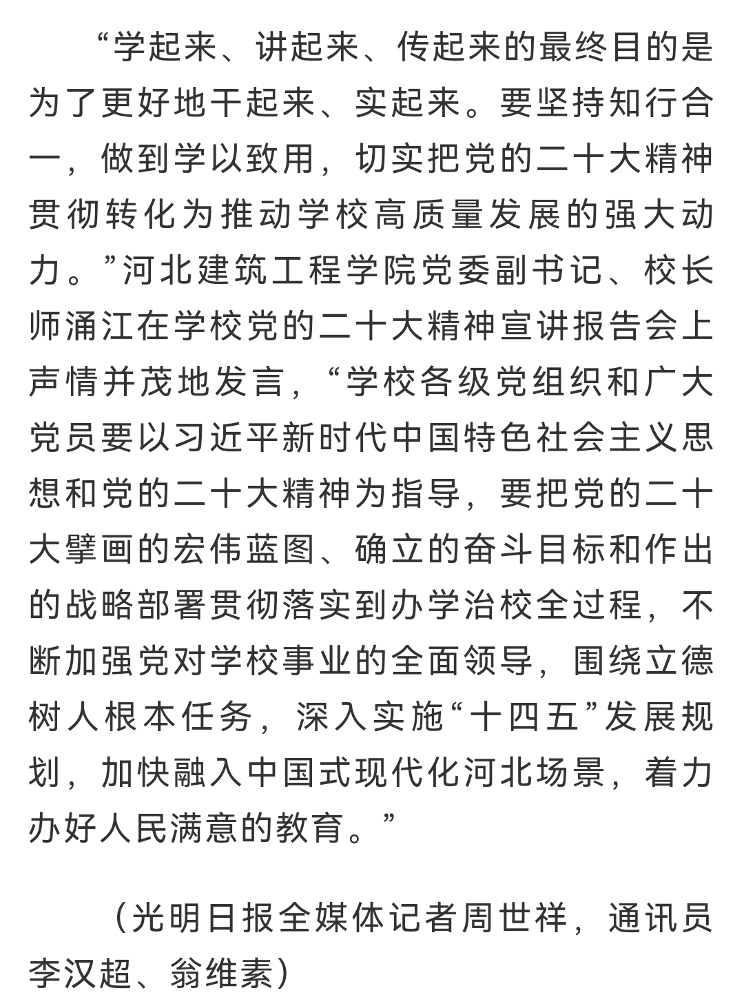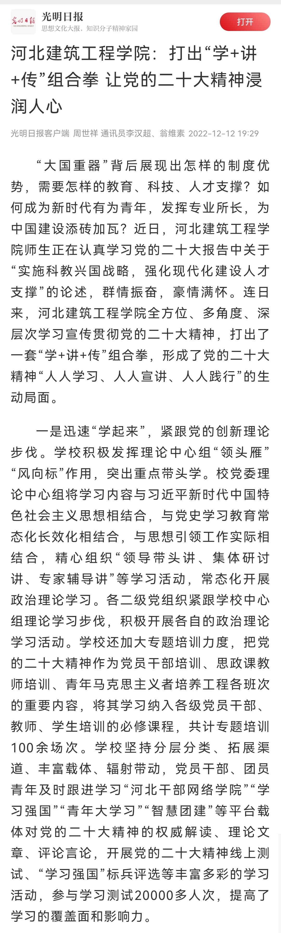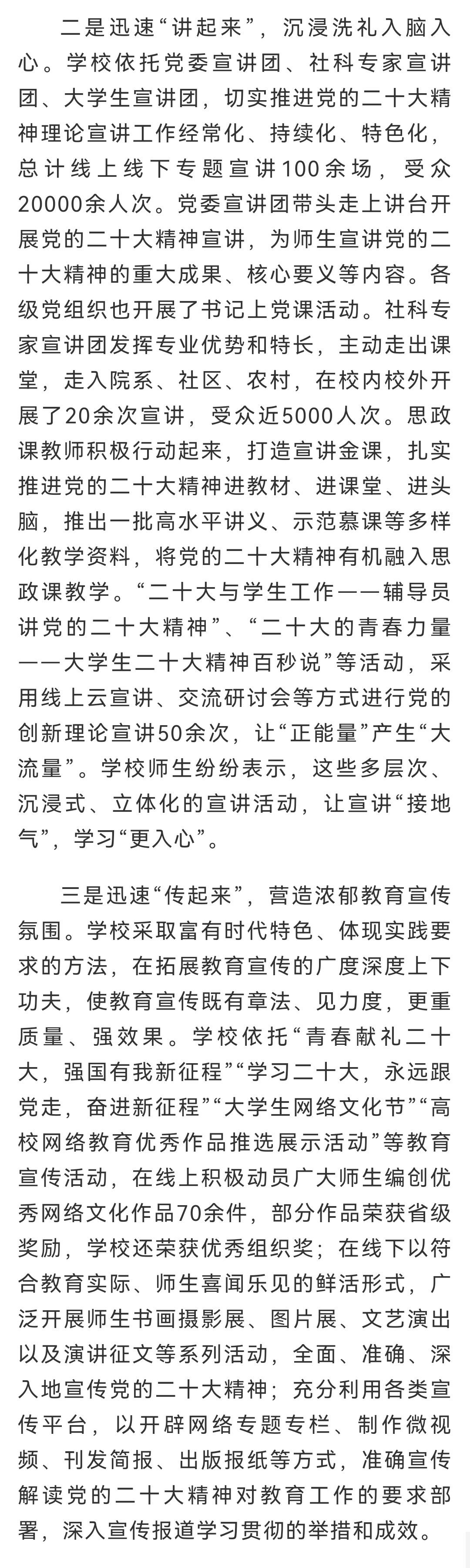 近日,光明日报客户端报道我校全方位、多角度、深层次学习宣传贯彻党的二十大精神,打出了一套“学+讲+传”组合拳,形成了党的二十大精神“人人学习、人人宣讲、人人践行”的生动局面。