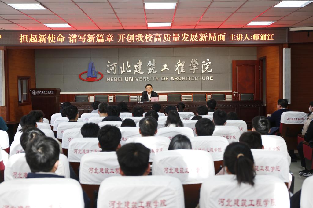 师涌江针对党的二十大报告中开辟马克思主义中国化时代化新境界、新时代新征程中国共产党的使命任务、加快构建新发展格局着力推动高质量发展等三部分内容进行了重点解读。他理论联系实际,结合国情、省情、校情,阐释了“中国式现代化”及其背景下的“河北场景”和“建院画卷”的概念、特征、目标及实施路径。同时勉励广大青年学子要把自己的理想同祖国的前途、民族的命运紧密联系在一起,勤学苦练、增长才干、珍惜韶华、不负青春,早日成长为一名有理想、有本领、有担当的高素质技术技能人才,让青春年华在为国家、为人民的奉献中焕发出绚丽光彩。