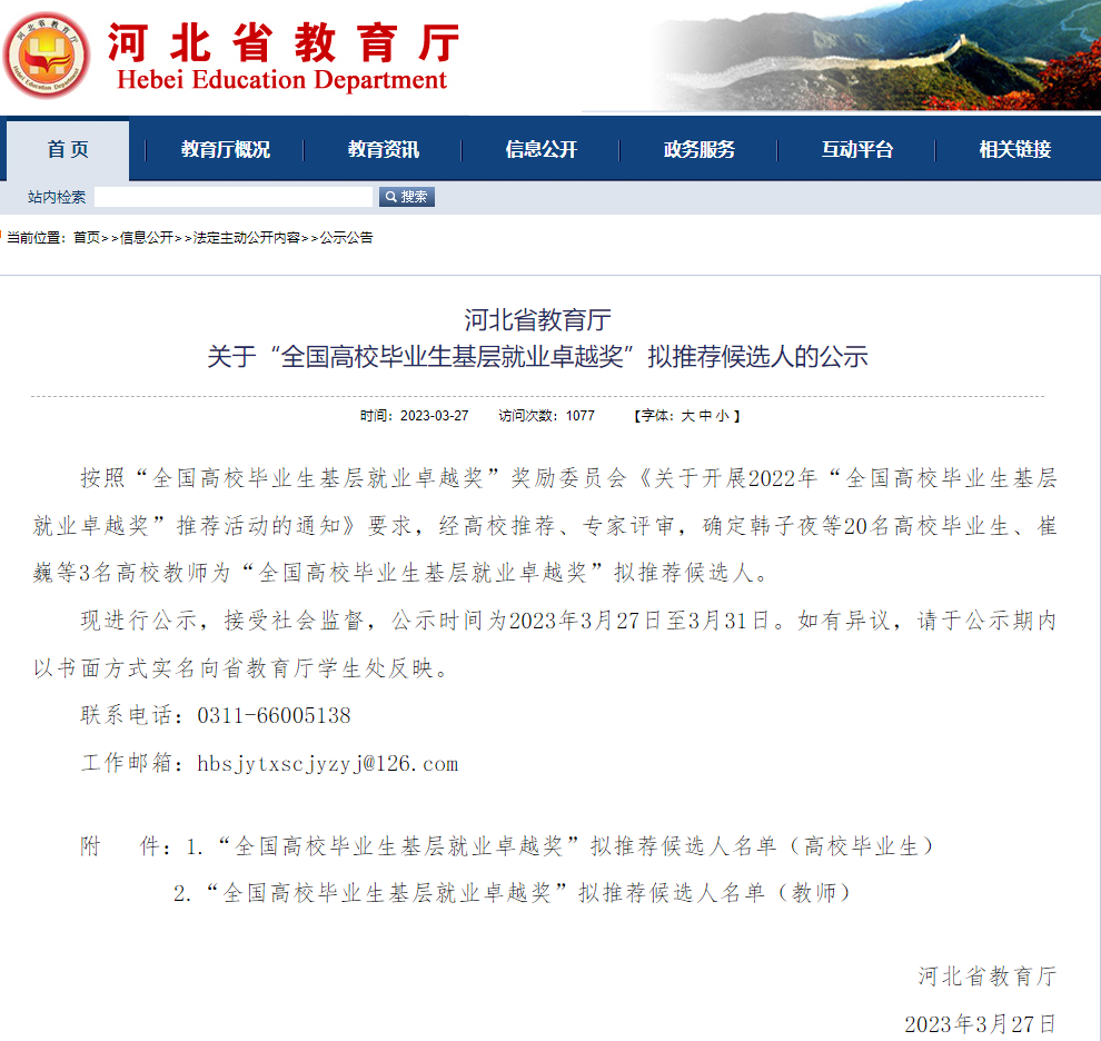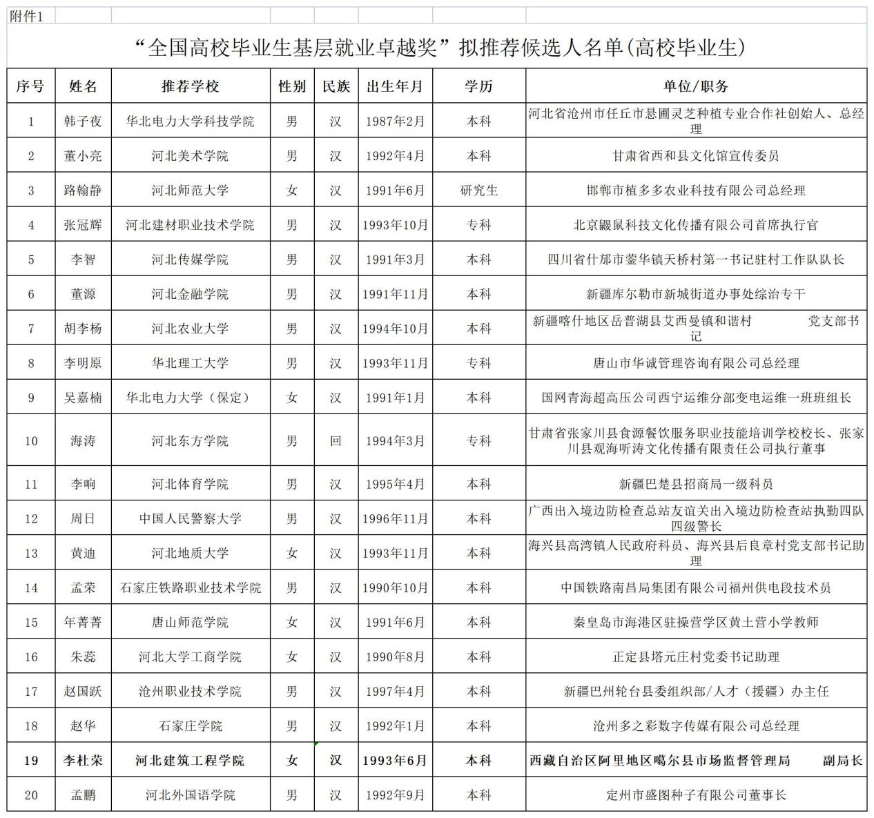 今年2月,河北省教育厅下发了《关于做好 2022 年“全国高校毕业生基层就业卓越奖”推荐工作的通知》,我校加强组织领导,严格评选程序,严把推荐标准,深入挖掘毕业生基层工作先进事迹,最终推荐投身西藏建设事业的优秀毕业生李杜荣为我校“基层就业卓越奖”候选人。