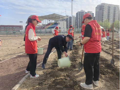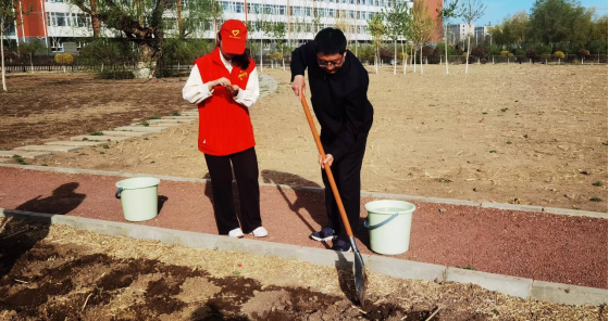 种植活动现场,大家热情高涨,校领导与师生志愿者一起,按照栽种要领展开劳作,挥锹铲土、播种施肥、提水浇灌,共同协作、干劲十足,每个步骤都认真细致,现场一派繁忙景象,为基地种下一片新绿,800颗观赏性向日葵种子孕育着无限美好新希望。种植完成后,青年志愿者们分别认种认养一颗向日葵,确保向日葵有人种有人管能成活。