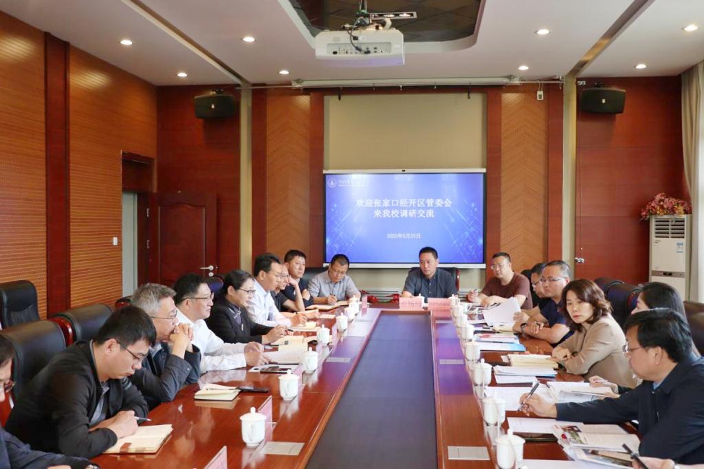 5月23日下午经开区管委会党工委组织部部长张丽丽来学校调研校地共建情况,经开区教体局、发改局、行政审批局等13个部门负责同志陪同调研。校党委书记师涌江,副校长姚冰以及党(校)办、组织部、人事处等8个部门负责同志参加了座谈。