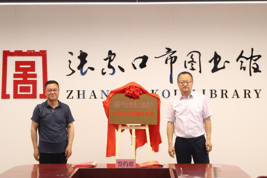 5月18日下午,我校与张家口市图书馆共建的“志愿服务基地”揭牌仪式在市图书馆会议室举行。副校长赵海军、市文化广电和旅游局二级调研员王树海、团委书记李晓庆、学生工作部副部长庞炜、市图书馆馆长王鹏、副馆长党宁等相关领导出席了揭牌仪式。