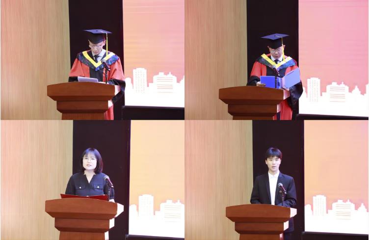 学生处处长孙彬宣读《关于表彰2023届省级优秀毕业生、校级优秀毕业生的决定》。教务处处长梁建明宣读2023届毕业生学位授予及毕业情况。电测192班王美鹏同学、物联211班王朔同学分别代表全体毕业生和全体在校生发言。建筑与艺术学院刘玮琦老师代表全校教职工发言。