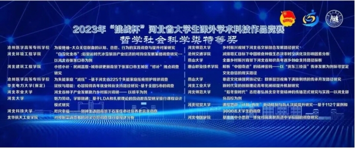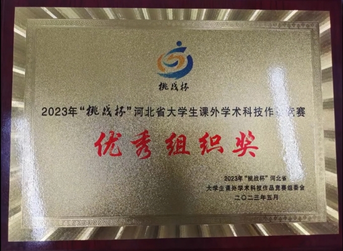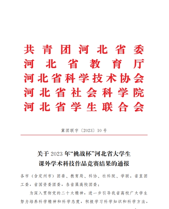 近日,共青团河北省委、省教育厅、省科协、省社会科学院、省学联下发了《关于2023年“挑战杯”河北省大学生课外学术科技作品竞赛结果的通报》,我校荣获优秀组织奖, 22项作品获省级奖项,其中,特等奖1项、一等奖4项、二等奖7项,三等奖10项。