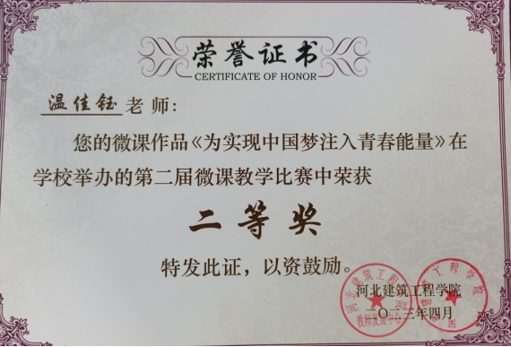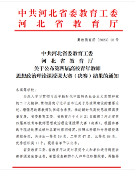 为了提升思政课教师的教学水平,马克思主义学院还开展了青年教师讲课比赛和老教师示范课活动,鼓励支持青年教师积极参加学校和省教育厅组织的各种教学竞赛。2023年初,在学校组织的教师微课竞赛中,马克思主义学院教师1人获二等奖,1人获三等奖。2023年6月,在河北省教育工委、河北省教育厅组织的河北省第四届高校青年教师思政课授课大赛中,我校思政课教师1人获《形势与政策》课(本科组)第一名一等奖,1人获《毛泽东思想和中国特色社会主义理论体系概论》课(本科组)第五名二等奖。2023年7月,在河北省教育厅、河北省军区战备建设局、河北省教科文卫工会联合举办的河北省第八届高等学校军事教师授课竞赛中,我校参赛教师获特等奖(前3名),并被授予“河北省高校军事课教学标兵”称号。