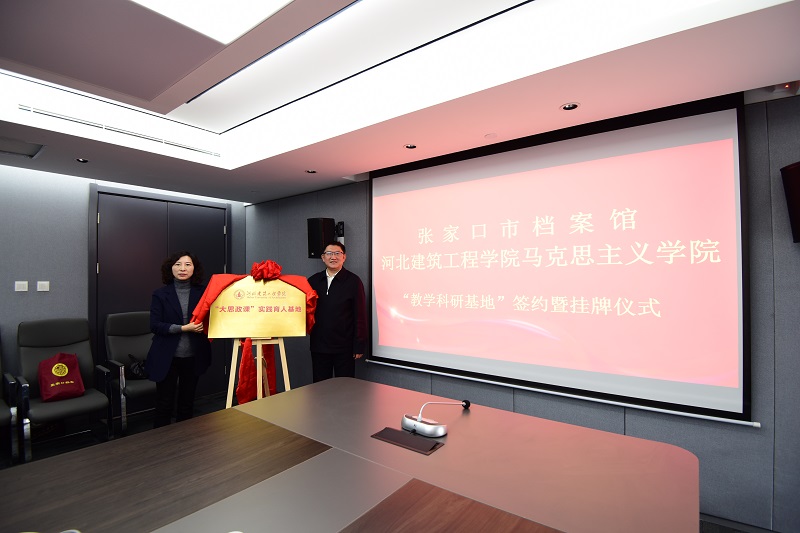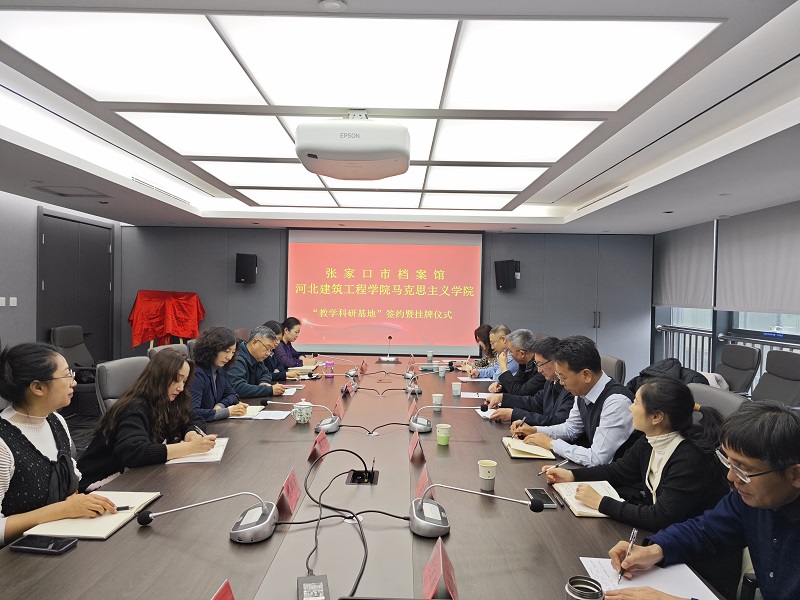 12月11日上午,我校与张家口市档案馆签约共建教学科研基地。校党委书记师涌江、教务处处长梁建明、科研产业处处长贾玉贵、马克思主义学院院长曹宇、市档案馆馆长马丽芳、三级调研员康文清、副馆长周瑾、副馆长李帅帅、党总支专职副书记陈鹏宇、地方志和编研部部长陈文静,及我校教师代表出席座谈会和签约仪式。曹宇与周瑾签订共建协议。师涌江与马丽芳为基地揭牌。