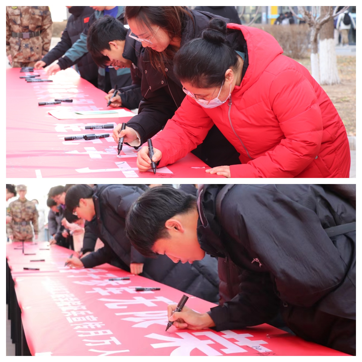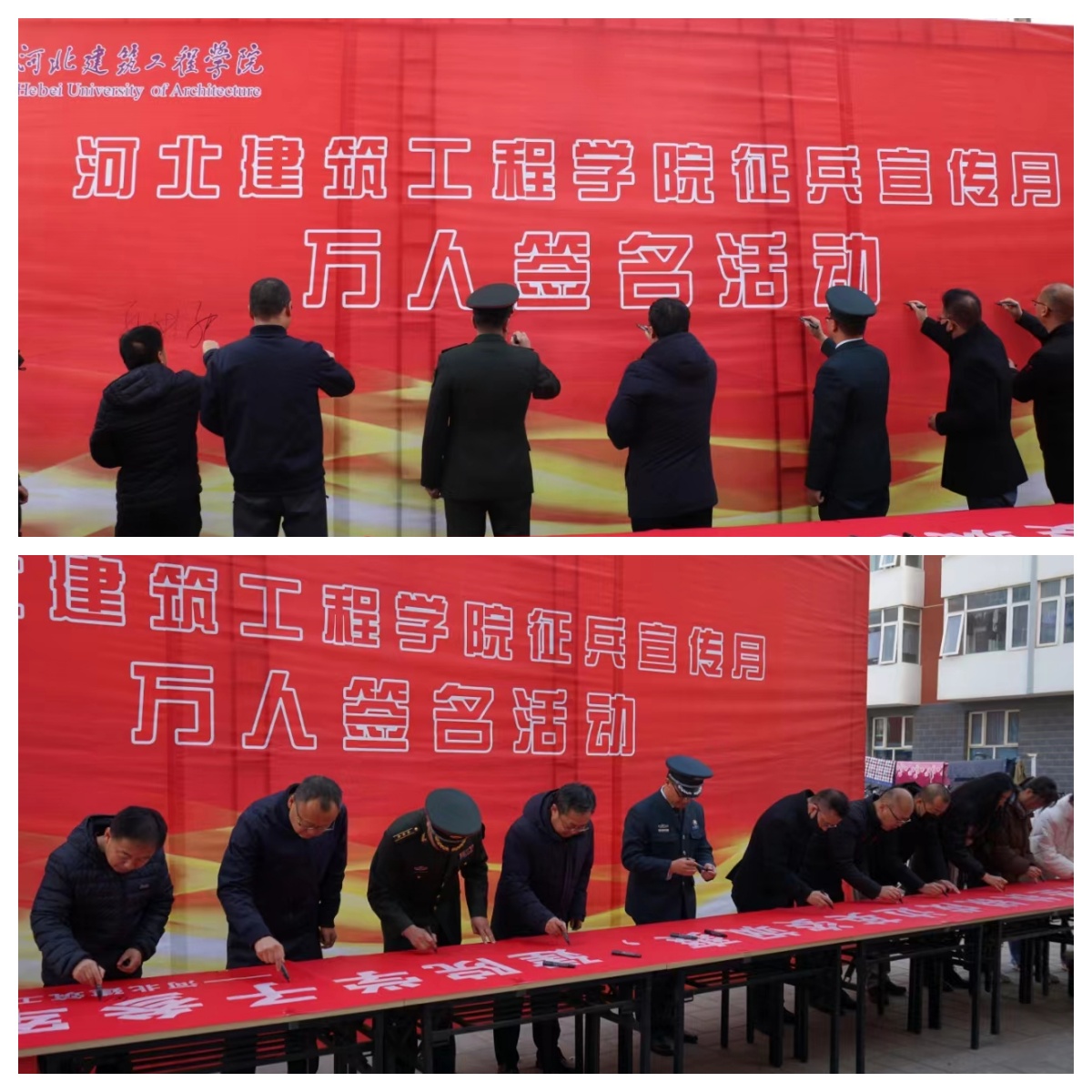 12月8日,我校征兵宣传月“万人签名”活动在学校10号宿舍楼前举行,线上签名同时启动。校长翁维素、副校长赵海军、党校办主任张文海、组织部部长肖立新、武装部部长孙彬、校团委书记李晓庆、桥东区人民武装部政委王树田、张家口军分区动员处参谋王宁等出席了本次活动。桥东区人民武装部征兵工作人员、我校院系领导、辅导员、国防后备营成员以及学生代表参加了本次活动。