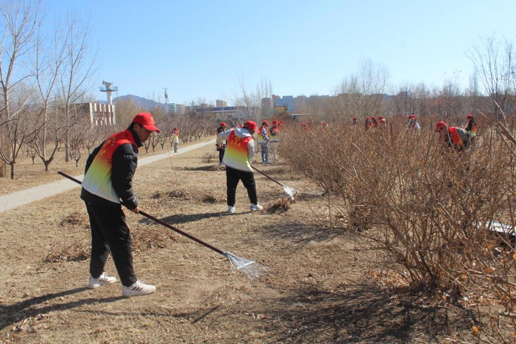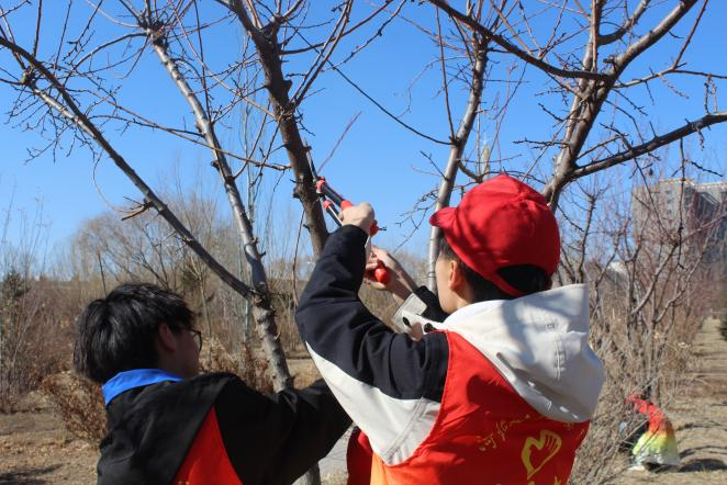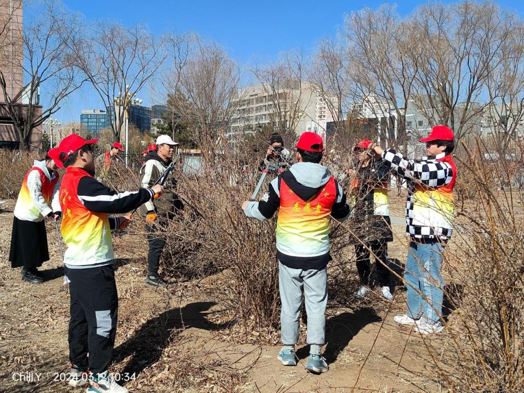 活动现场, 70余名志愿者身穿红马甲、头戴志愿者帽,热情高涨,分组合作在校内各片区开展志愿服务活动。生态文明实践社团的志愿者悬挂横幅展板,在学生宿舍区宣传生态环境保护知识,促进绿色生活理念的普及和推广。校青协部分志愿者仔细倾听绿化养护人员讲解树木特性,在其指导下修剪树木;部分志愿者重点清扫花坛、草坪等绿化区域的树枝杂草,捡拾校园纸屑、塑料袋等垃圾,大家干劲十足、团结协作、默契配合。