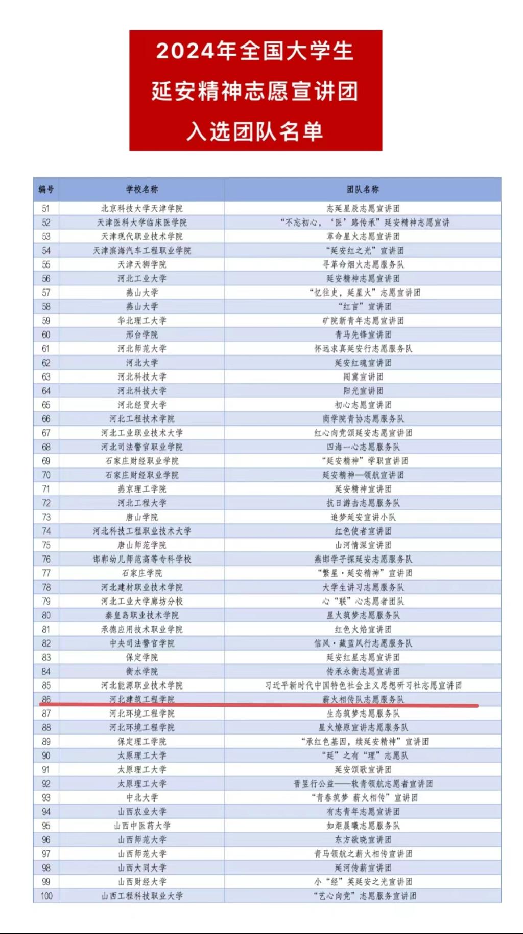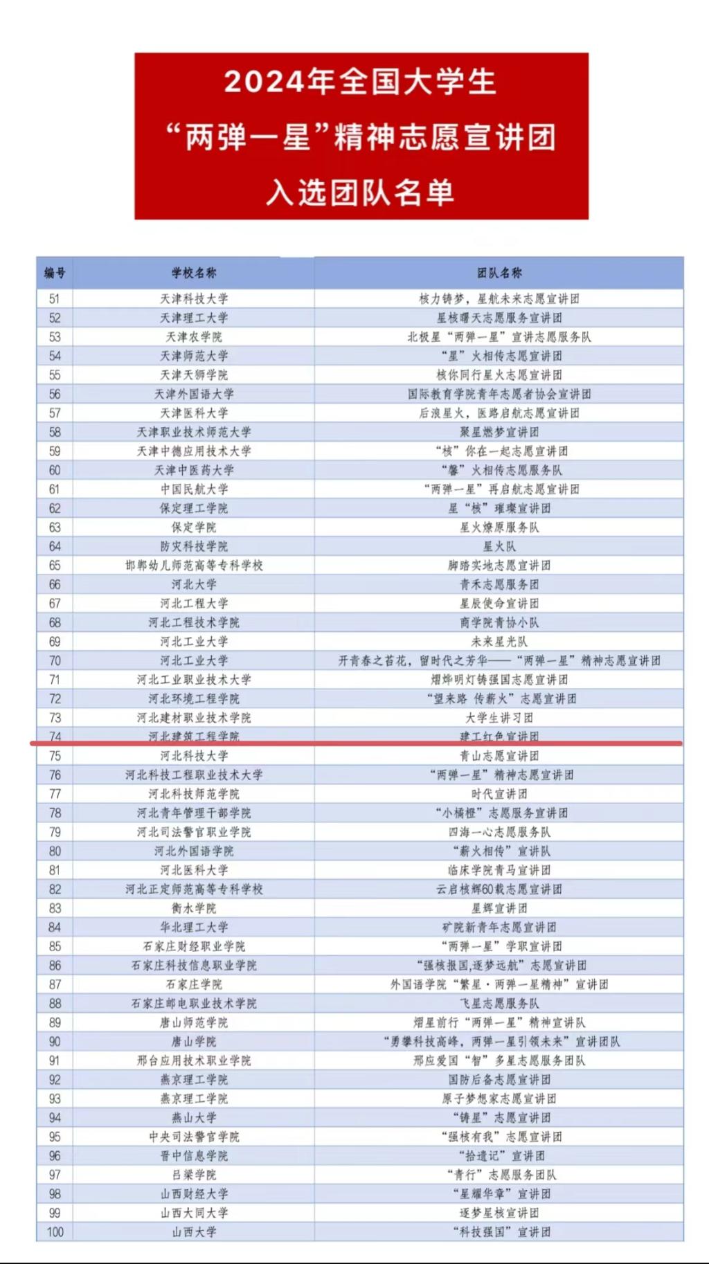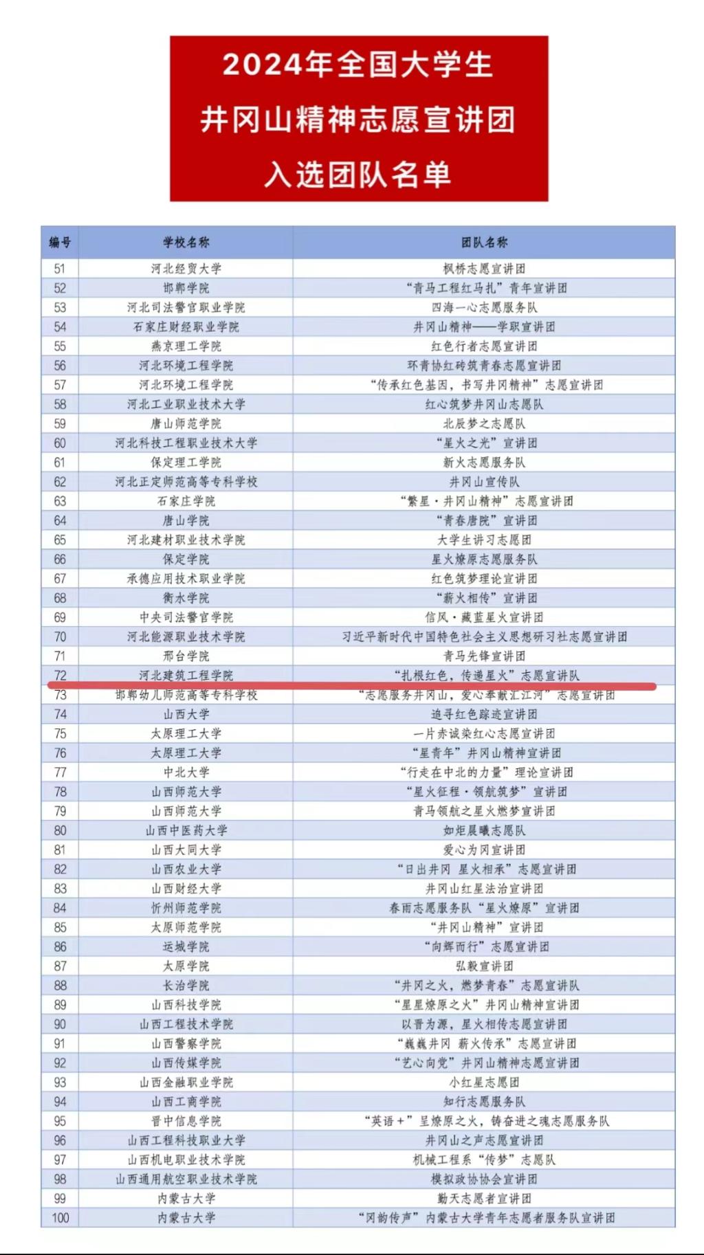 近日,团中央青年志愿者行动指导中心联合相关单位从全国遴选出全国大学生“两弹一星”精神志愿宣讲团、全国大学生井冈山精神志愿宣讲团、全国大学生延安精神志愿宣讲团各一千支优秀队伍,我校申报的“扎根红色,传递星火”志愿宣讲队、“薪火相传志愿服务队”和“建工红色宣讲团”3支队伍全部入选。
