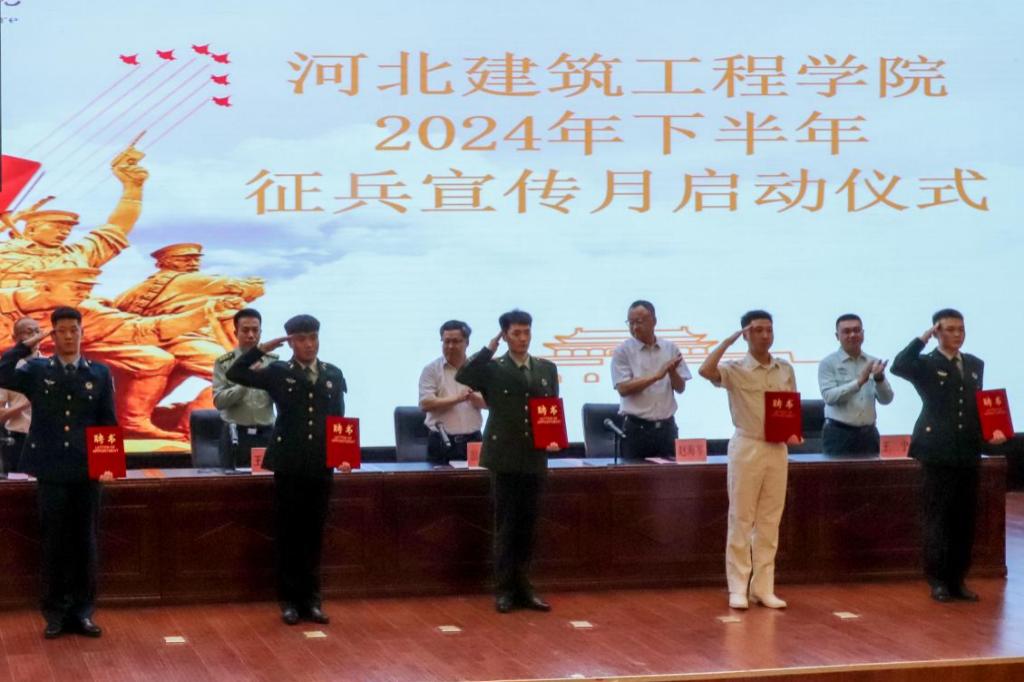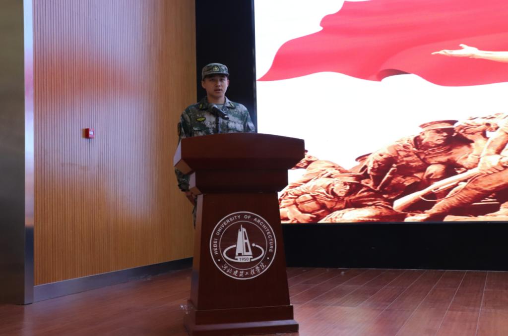 与会领导为征兵宣传形象大使颁发了聘书。国防后备营退役大学生士兵代表建筑212班张旭泱同学分享了个人的军旅历程,讲述了自己的成长与收获,并向广大同学发出了参军报国的倡议。国防后备营应征报名学生代表水202班任张泽同学作为报名参军学生代表向学校给予的支持表示了深深的感谢,表达了对部队的憧憬和向往,以及绝不辜负领导、老师期望的决心。