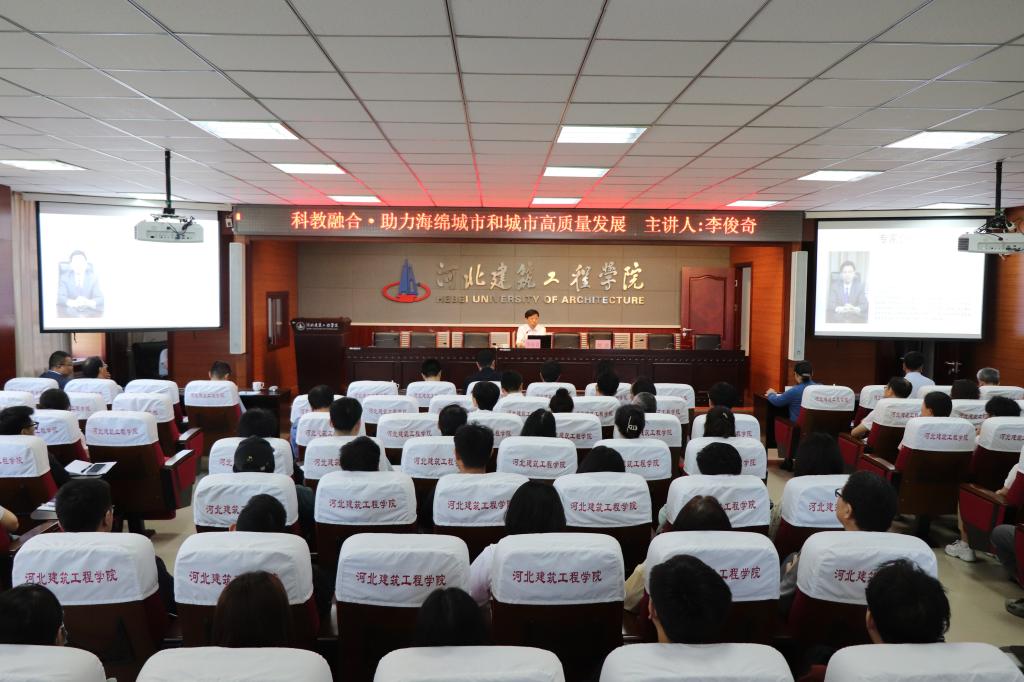 5月31日,北京建筑大学副校长李俊奇教授应邀来到我校,进行了题为“科教融合·助力海绵城市建设和城市高质量发展”的学术讲座。北京建筑大学的相关人员和我校市政与环境工程系、土木工程学院、建筑与艺术学院110名师生聆听了讲座,河北省教育厅一级调研员王兴达出席此次活动。讲座由我校副校长姚冰主持。