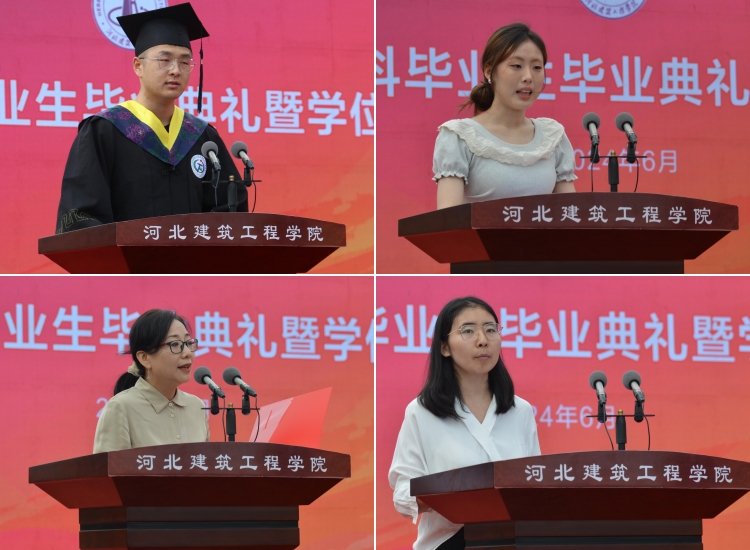 工204班张捷同学、电智231班刘旭同学分别代表毕业生和在校生发言。建筑191班赵紫萱家长付雅萍代表毕业生家长发言,机械工程学院原琨老师代表教职工发言。