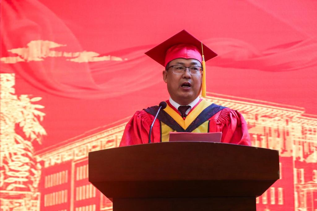 校长翁维素代表学校向顺利完成学业的同学们表示最热烈的祝贺和最美好的祝愿,向辛勤付出的各位导师及管理服务人员表示衷心的感谢!他嘱托毕业研究生:一要耐住寂寞,板凳甘坐十年冷,涵养“千磨万击还坚劲,任尔东西南北风”的独立人格。二要甘于平凡,立德修身再齐家,能超脱于物质得失,保持内心的平和。三要敢于创造,守正创新笃行远,为祖国的繁荣富强、民族的伟大复兴贡献应有力量。四要追求真理,路远不灭求索心,保持炽热而坚定的求索之心,努力书写更加辉煌的人生篇章。