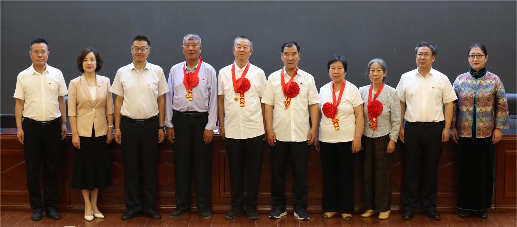 翁维素为学校“在党五十年”老党员代表颁发纪念章。
