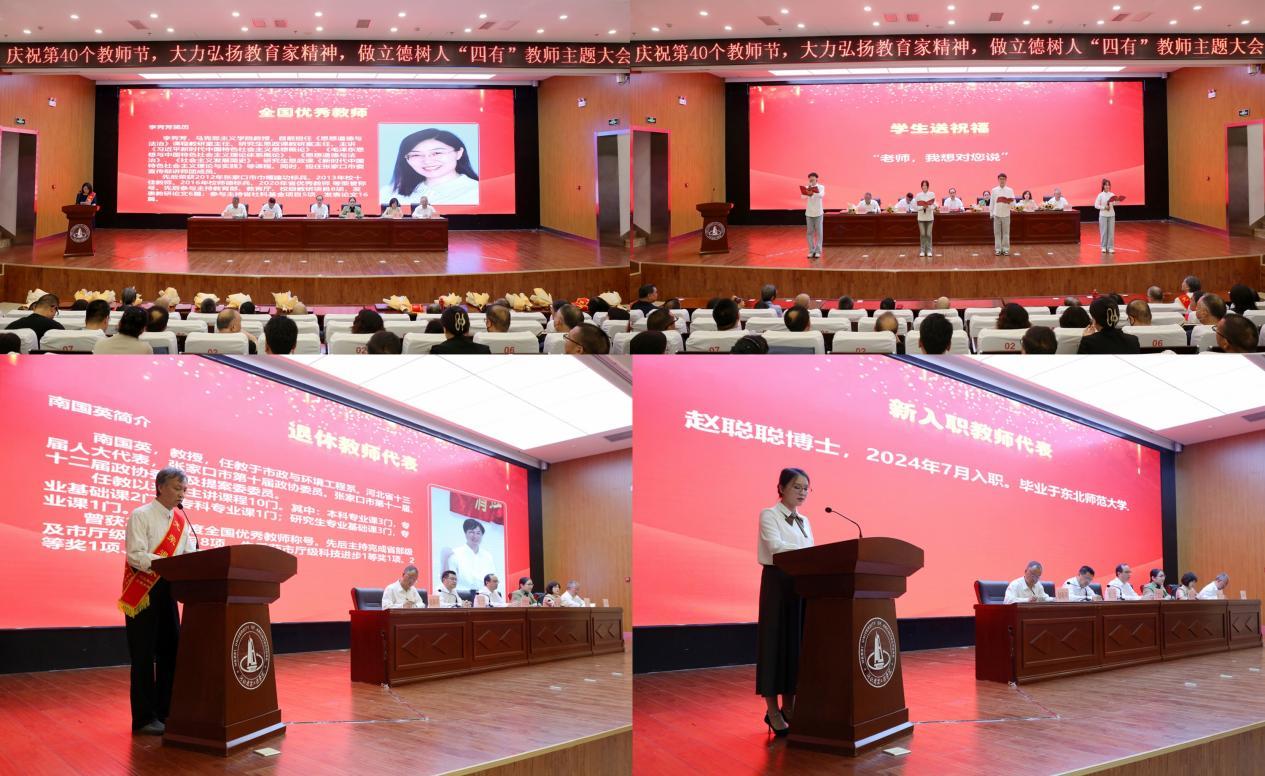 9月10日,我校“庆祝第40个教师节,大力弘扬教育家精神,做立德树人‘四有’教师主题大会”在新能源交流中心举行。校长王建民作主题讲话,副校长张立群宣读获表彰教师名单,副校长姚冰主持会议。全体在校领导、教师,退休教师代表和学生代表等近400人参加会议。